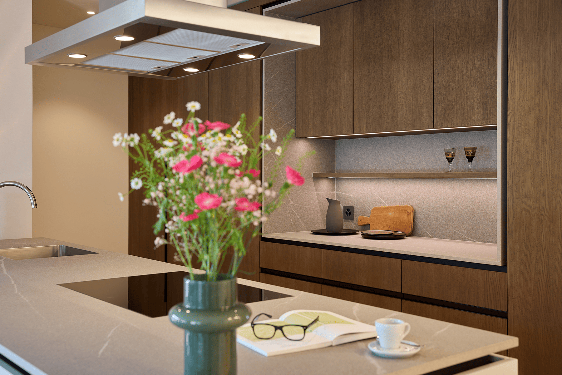 | Umluft oder Abluft? | Abluft – Dunstabzugshaube über der Kücheninsel oder Muldenlüfter fürs Kochfeld. |